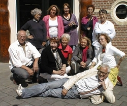 KUNST IS MEER DAN EEN BOODSCHAP door: Tine Hekker 'Kunst is meer dan een boodschap', zegt Huub Mous, kunsthistricus, die afgelopen vrijdag in Koudum in het beeldhouwcentrum van Herma Bovenkerk was. 'Kunst gaat veel dieper.' Mous was in Koudum om een aantal werkstukken te beoordelen, waarvan in de eerste plaats de eindwerkstukken van de cursisten van de tweejarige beeldhouwopleiding de grootste inbreng hadden. Alle werken van de negen cursisten kregen persoonlijke aandacht. Aandacht die behalve lovende, ook hier en daar opbouwende kritiek inhield. 'Wat is de rode draad', beoogde Mous, 'waar gaat het om'. De vertellende manier van een aantal beelden konden zijn goedkeuring wegdragen, 'maar' vulde hij aan 'denk wel om de symboliek, het mysterie en de artisticiteit. Behlave dat een beeld voor zich moet spreken, mag het ook wel mystiek in zich hebben'. Tijdens de twee jarige opleiding wordt er naast de verplichte opdrachten veel ruimte gemaakt voor vrij werk. 'Vormentaal wordt geleerd, de dingen anders doen dan je gewend bent, kijk anders naar het leven en haal daar inspiratie uit', zegt Herma. Voor een aantal cursisten was het een kennismaking vanuit het niets, voor een deel waren er al veel langer bezig op het vlak van beeldende kunst. Ook persoonlijke motieven kunnen een rol spelen in het volgen van deze beeldhouwopleiding. Koudumer Arnoud Kiers is iemand voor wie dat geldt. 'Ikbegon vanuit een privé gedachte. Ik wilde me eens los maken van allerlei lasten uit het verleden die ik maar voortdurend met me mee tors. Gaandeweg begon ik in de opleiding steeds meer en meer mogelijkheden te zien'. Eén van de werkstukken van Kiers is een nogal omvangrijk schip van hout, voorstellende het gemeente bestuur van Nijefurd met aan het roer de burgemeester. Het schip wendt de steven af van een naastgelegen kunstwerk, voorstellen het volk. 'De titel is,'zegt Kiers, 'De Herindeling'Een werkstuk, of noem het een beelden werkstuk met een wel zeer persoonlijke insteek. Beeldhouwen is behalve kunst ook een ambacht. Dat vraagt om regelmatige oefening en het ontwikkelen van artistieke kwaliteit. Het niveau in Koudum vond Mous zeer redelijk tot goed. 'Maar het zijn natuurlijk geen mensen met een kunstacademische scholing. Om volleerd kunstenaar te zijn of te worden heb je meer tijd nodig. Dat moet groeien. Maar,'voegde Mous er aan toe, 'ik vind het altijd een groot genoegen om deze werken te zien en er met de cursisten over te praten.' Op zaterdagmiddag 20 juni werd de expositie van de eind-examenkandidaten geopend met een feestelijke bijeenkomst op het Frieslandplein. Het was Linda Wormsbecher, de rechterhand van Herma Bovenkerk, die de openingshandeling verrichte. De resultaten, van de negen cursisten (8 dames en 1 heer) zijn te zien op en rondom het Frieslandplein en op verdere plaatsen in Koudum. De expositie zal duren tot 13 september. Samen met de opening van de beeldhouwexpositie is ook de Koudumer-Kunst-Route van start gegaan. Deze alweer jaren bestaande zomerse Kunstroute omvat ook dit keer weer een enorme diversiteit aan beelden, en aan materialen waarvan de beelden gemaakt zijn. Verrassende resultaten die door het hele dorp zijn opgesteld. Ze zijn gemaakt door alle cursisten van het beeldhouwcentrum. De gebruikte materialen omvatten vele materialen, zoals albast, brons, Braciliaans speksteen, hout, metaal en stof. Aan de Kunstroute die tot 13 september duurt, is ook een p;rijsvraag verbonden. De start is in het beeldhouwcentrum aan de Hoofstraat waar, behalve kunstkaarten van de tentoongestelde beelden, ook de (gratis)route verkrijgbaar is. Op de foto de negen geslaagden van de beeldhouwopleiding. V.l.n.r. achterste rij: Dite Alonso, Saskia de Backker, Clasina Flapper, Ingrid Jungcurt. Voorste rij: Arnaud Kiers, Anneke Kuperus-Kapteijn, Anneke Piersma, Maria Vis-Schüllier, Liesbeth Tamsma. Staand rechts Herma Bovenkerk, liggend voor Huub Mous. (foto Tine Hekker).